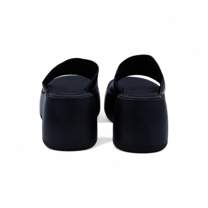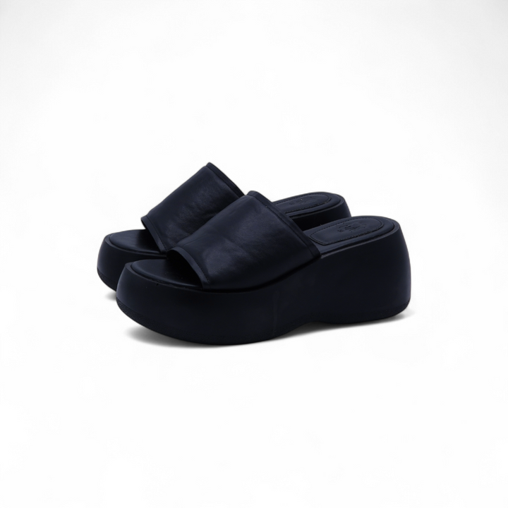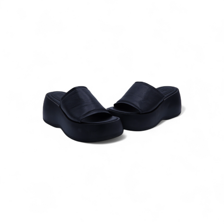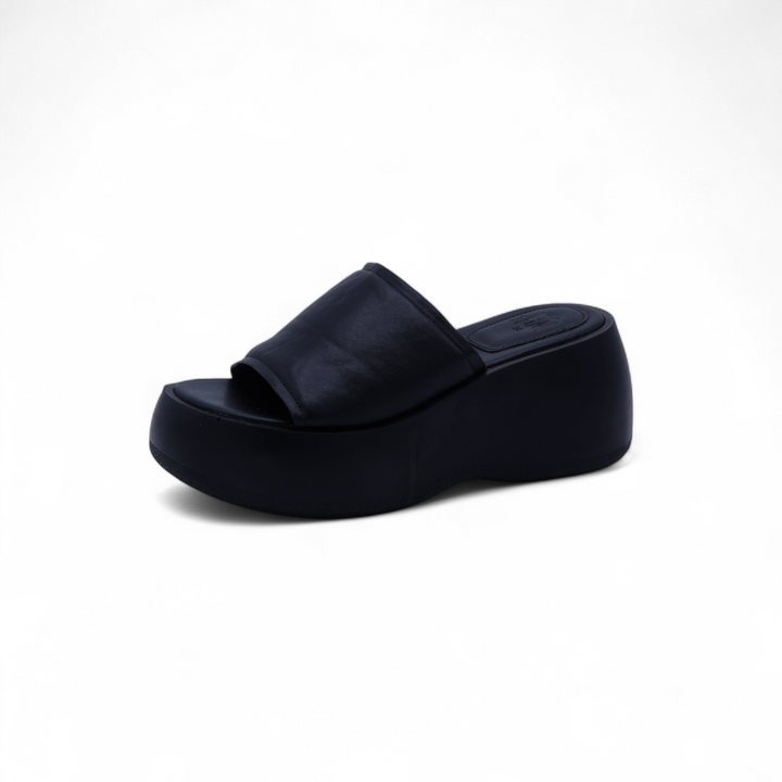• A bold black platform slide with a wedge heel.