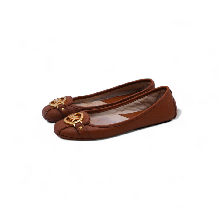 • Michael Kors brown leather ballet flats with a signature gold MK logo on the toe.