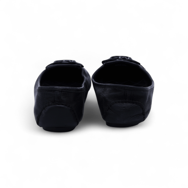 • Pair of black Michael Kors ballet flats with embossed logos and quilted insoles.